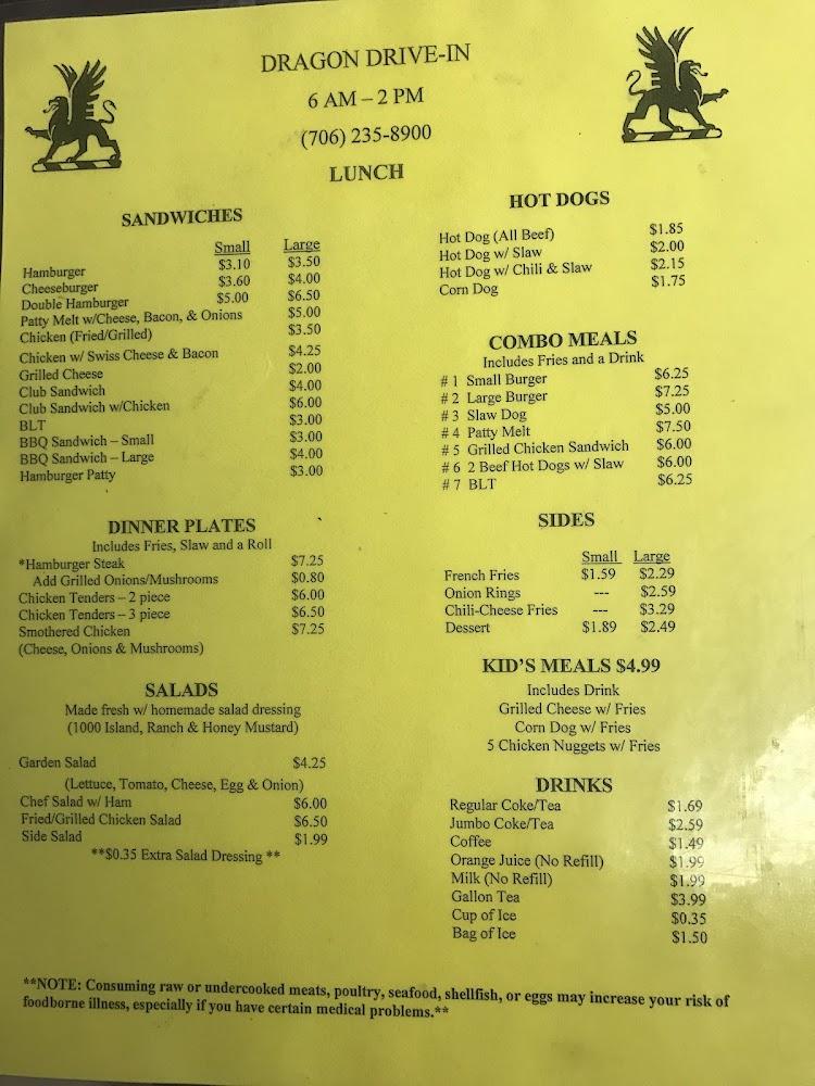 Dragon Drive-In serves a diverse menu focused on classic American comfort food. Breakfast options include biscuits, pancakes, and breakfast sandwiches, attracting early risers. Every dish aims to please taste buds and satisfy hunger. The lunch menu features hearty classics like steak and gravy, fried okra, and cornbread, offering local flavors cherished by the community. Veggie lovers can enjoy grits and fresh sides. Desserts, including punch bowl cake, add a sweet finish. Service is quick yet caring, ensuring every meal feels personal. Dragon Drive-In offers great meals, making it a must-try in Lindale.